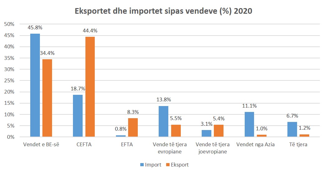 Bilanci negativ tregtar në Kosovë vazhdon me importet (3.3 miliardë euro) që janë shumëfish më të mëdha se eksportet (475 milionë euro), në vitin 2020. Sipas të dhënave të Agjencisë së Statistikave të Kosovës, pothuajse pjesa më e madhe (45.8%) e importeve vijnë nga vendet e BE-së, ndërsa pjesa më e madhe e eksporteve (44.4%) drejtohen drejt vendeve të CEFTA-s.
