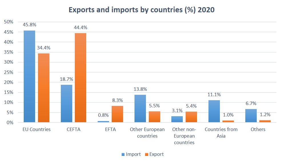 The negative trade balance in Kosovo continues with imports (3.3 billion Euro) largely outweighing exports (475 million Euro), in 2020. According to the data of Kosovo Statistics Agency, almost the majority (45.8%) of imports come from EU countries, whereas the bulk of exports (44.4%) is directed towards CEFTA countries.